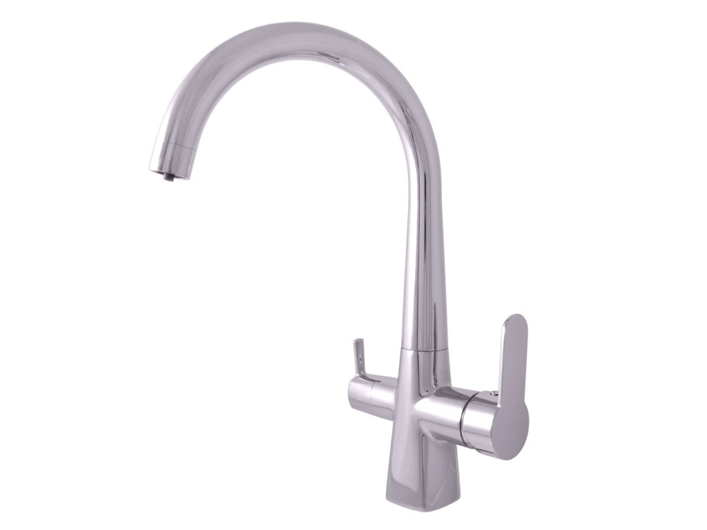 Trojitá kuchyňská baterie Iris s lesklým chromovým povrchem. Určena pro teplou, studenou a filtrovanou vodu, ideální pro připojení k filtrům určeným pro přímý tlak.